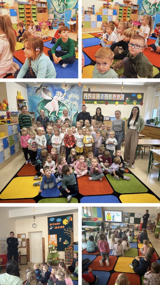 W dniu 2 października oddziały przedszkolne odwiedził sierż. szt. Szymon Prokop z Komisariatu Policji w Strawczynie. Tematem przewodnim było bezpieczeństwo dzieci na drogach. Pan policjant przypominał jak prawidłowo przechodzić przez jezdnię. Opowiedział też o korzyściach z noszenia elementów odblaskowych.